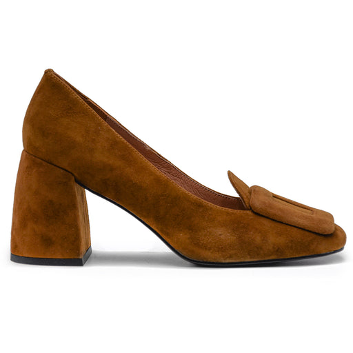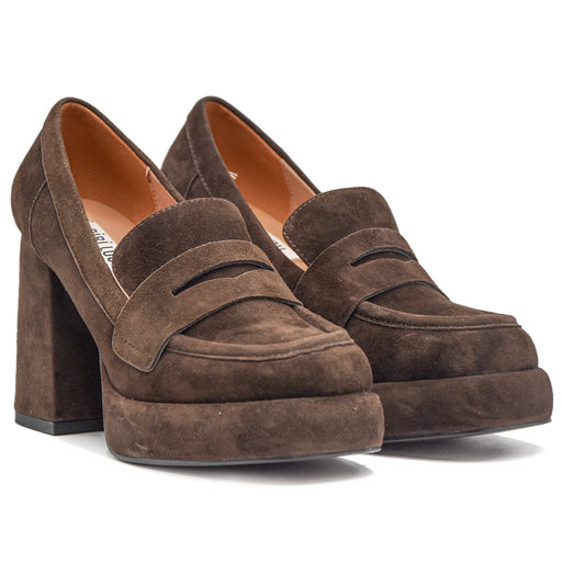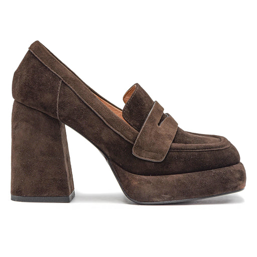 Bibi Lou• Mocassino in camoscio marrone • Fascetta e vaschetta frontale • Punta squadrata • Interno in pelle • Tacco largo di 5 cm • Suola in gomma antisci...
