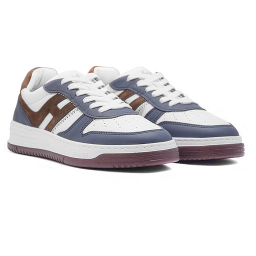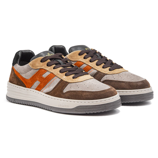 Hogan• Sneaker Hogan donna H681 • Tomaia in pelle scamosciata marrone e cuoio con H laterale e tallone bianco • Suola leggera con logo tono su tono alta...