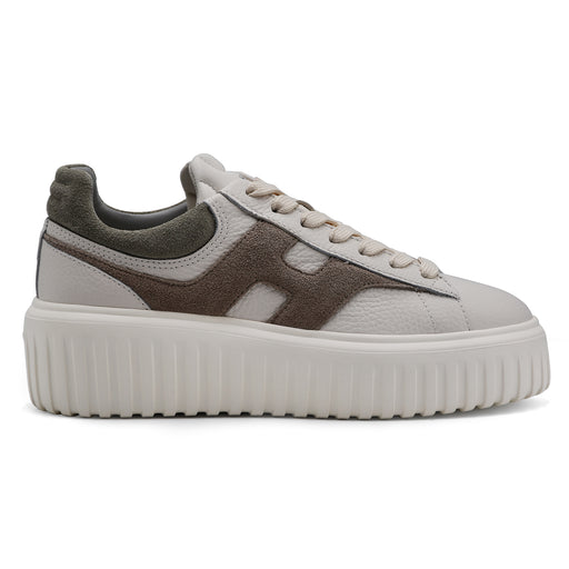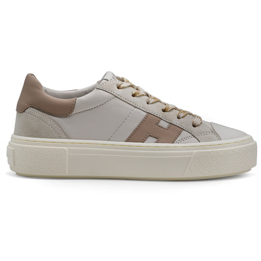 Hogan• Sneakers Hogan H714 da donna contemporanee• Tomaia in pelle scamosciata beige • Inserti in pelle bianca liscia a contrasto• Iconica H laterale to...