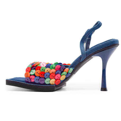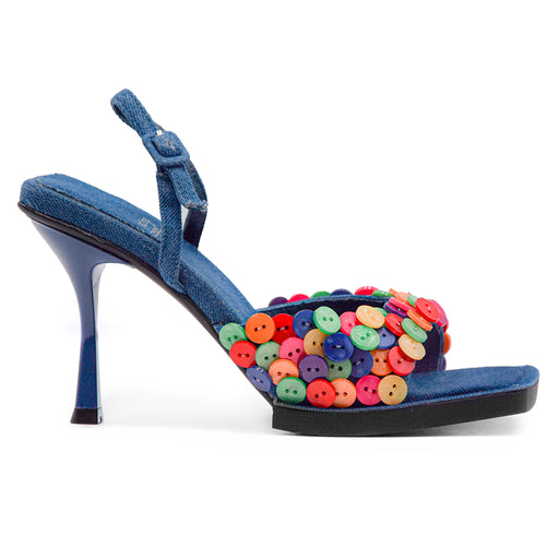 Jeffrey Campbell• Sandalo piatto open toe in denim • Dettaglio button fly • Punta quadrata • Interno in pelle e tessuto • Tacco di 3 cm • Suola in gomma • Veste pe...