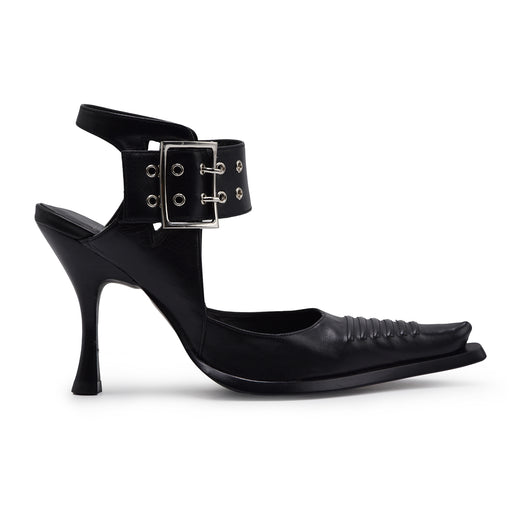 Jeffrey Campbell• Slingback Jeffrey Campbell DIRECTED • Tomaia in pelle nera con cinturino con doppi fori regolabili • Silhouette a punta goffrata e allungata, mol...