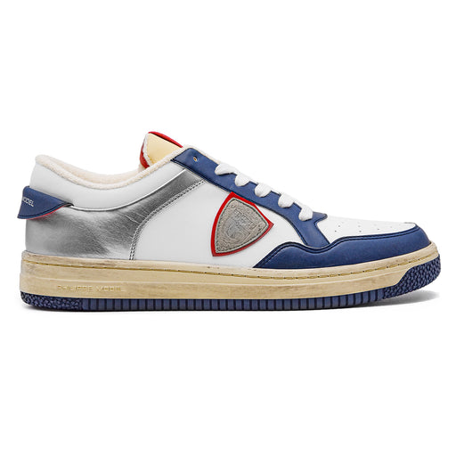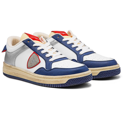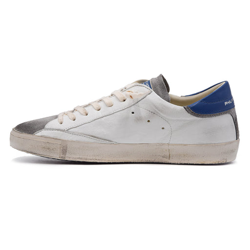 Philippe Model• Sneakers in vitello invecchiato e abrasivato bianco e blu • Dettaglio sagomato in gomma che abbraccia la caviglia • Traforatura sulla punta • Sol...