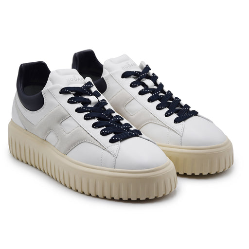 Hogan• Sneakers Hogan H-Stripes uomo • Morbida nappa bianca con H laterale in camoscio grigio ghiaccio • Dettagli in pelle blu sul talloncino • Design c...