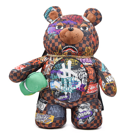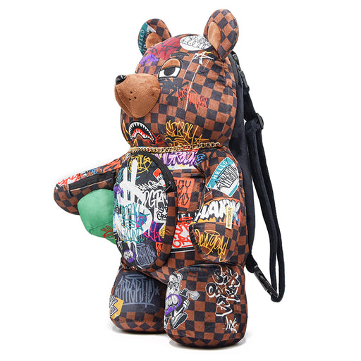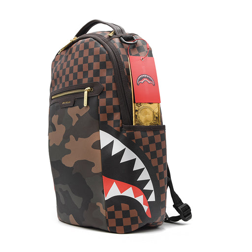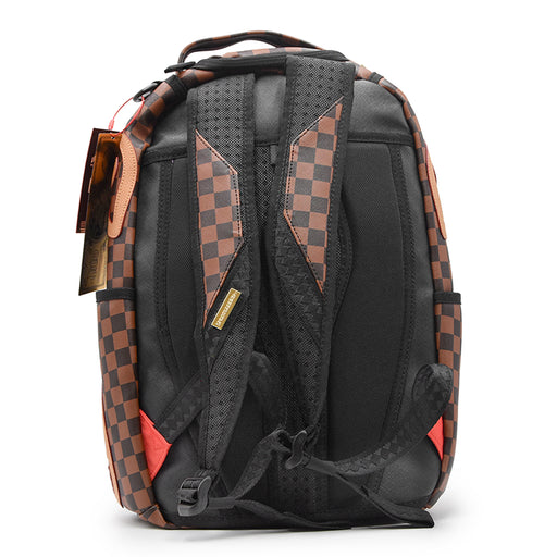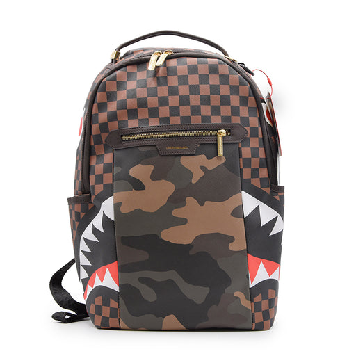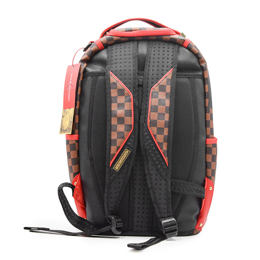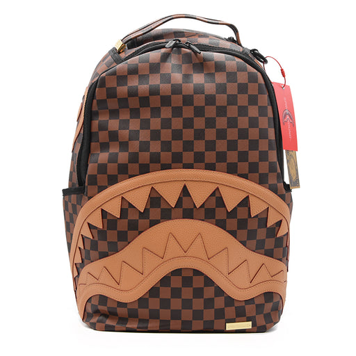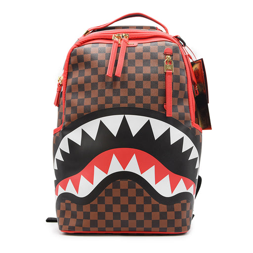 Sprayground• Zaino Sprayground HENNYVILLE • Iconica bocca Shark rossa in primo piano, con scacchiera nero e marrone con dettagli beige• Ecopelle e tessuto mol...
