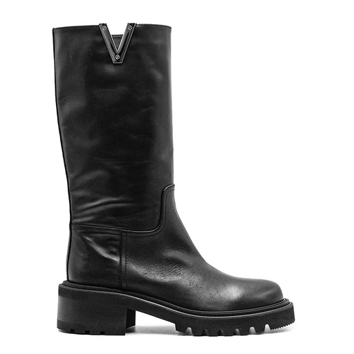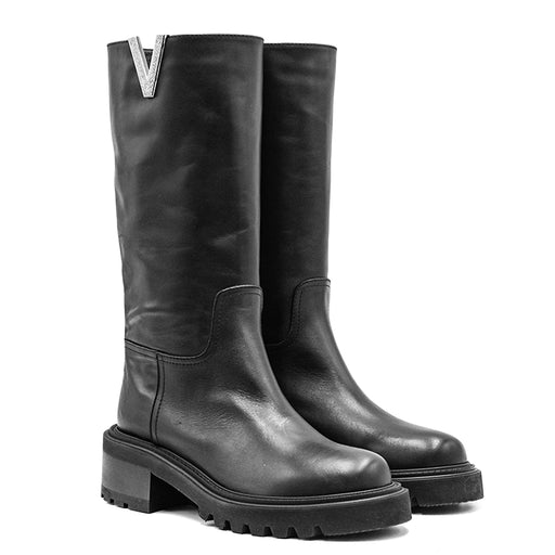 Via Roma 15• Stivale tubolare in pelle nero • Iconica V dorata laterale • Look raffinato ed essenziale • Prodotto artigianale • Punta stondata • Tacco di 6 cm...
