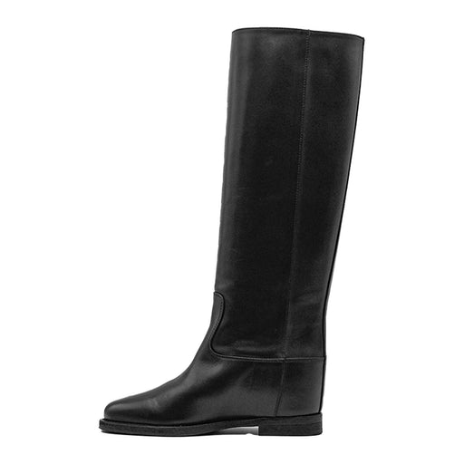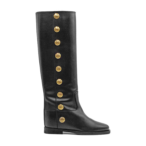Via Roma 15Stivale Via Roma 15 da donna in pelle nera, prodotto artigianalmente. Dettaglio dell’iconica V oro laterale. Privo di chiusure. Punta stondata e c...