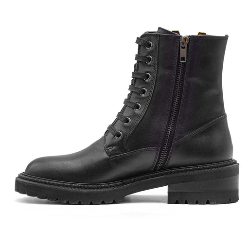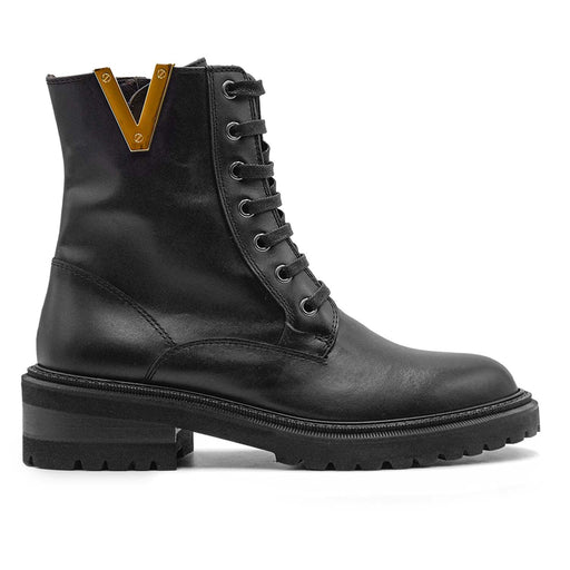 Via Roma 15Tronchetto Via Roma 15 da donna in pelle nero, prodotto artigianalmente. Dettaglio dell’iconica V dorata laterale. Privo di chiusure. Punta stondat...