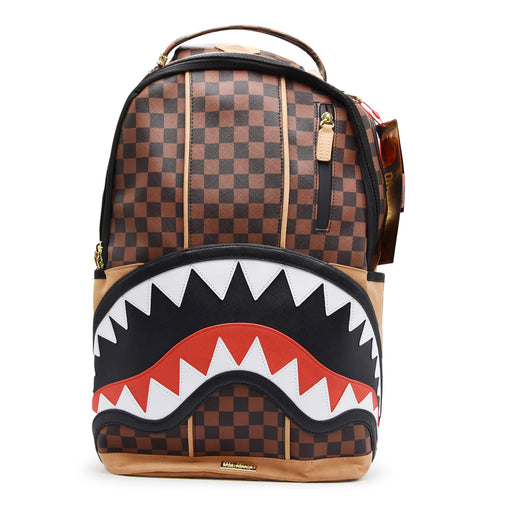 Sprayground• Zaino Sprayground HENNYVILLE • Iconica bocca Shark rossa in primo piano, con scacchiera nero e marrone con dettagli beige• Ecopelle e tessuto mol...
