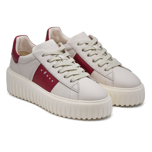 • Hogan H Stripes women's sporty sneaker with elegant details • Soft ivory leather with contrasting burgundy padded heel • Lateral H that extend...
