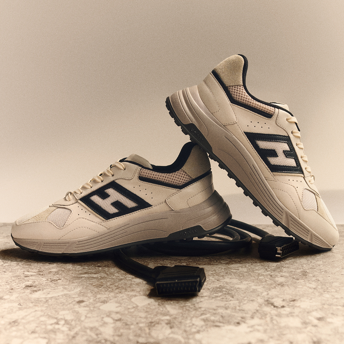 • Hogan Hyperlight men's ivory and brown sneakers • Suede leather with nappa inserts • H lateral oblique • Rounded toe and lace-up closure • Remov...