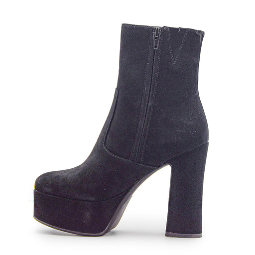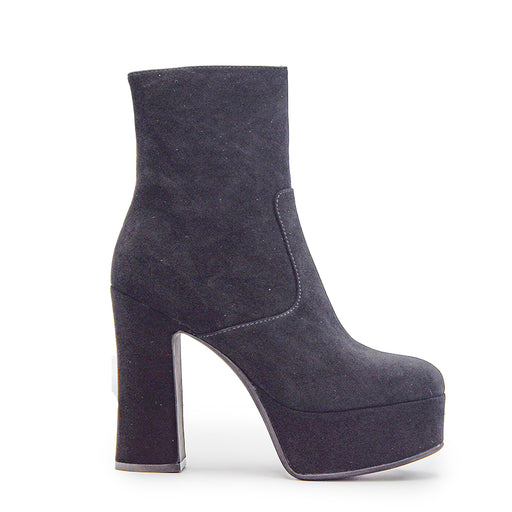 Jeffrey Campbell• Black suede ankle boot • Side zip • Elastic V-notch on the top line • Almond tip • Interior in leather and fabric • 12cm stacked block heel...