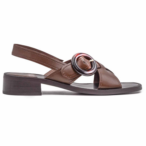 Jeffrey Campbell• Brown leather sandal • Non-adjustable double crossed band upper • Retractable mini elastic • Bakelite buckle • Square tip • Leather interio...