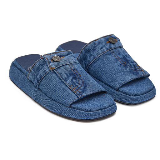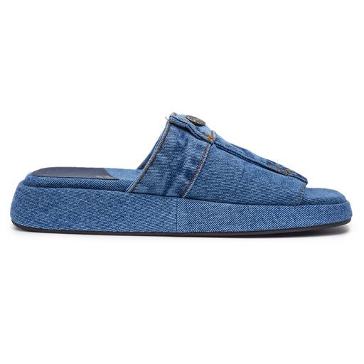 Jeffrey Campbell• Flat open toe sandal in denim • Button fly detail • Square tip • Interior in leather and fabric • 3 cm heel • Rubber sole • Fits true to s...