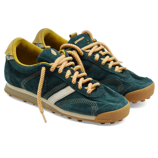Satorisan• Sneakers Satorisan Chacrona da uomo • Tessuto verde marino con inserti in vera pelle scamosciata beige • Logo Satorisan nella linguetta e scritt...