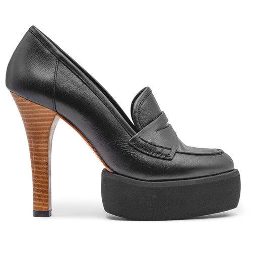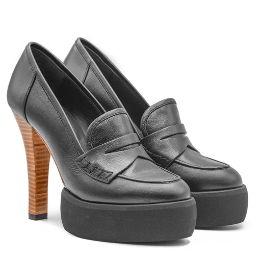Paloma Barceló• Moccasin in soft black leather • Rounded toe and visible stitching • Leather lining and insole • 12 cm wooden heel • Particular plateau with...