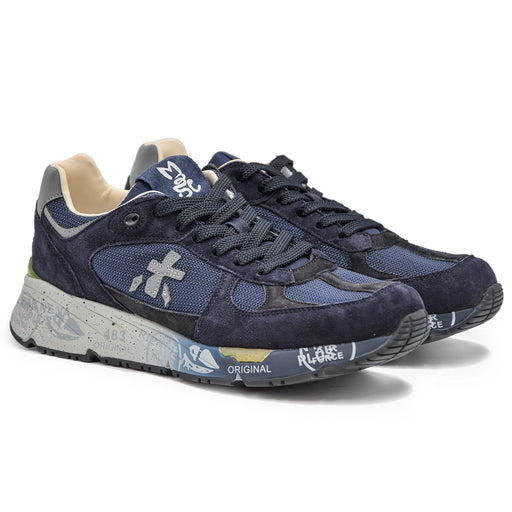 Premiata• Premiata Mick 7721 blue sneaker • Upper in suede, leather and technical nylon • Contrasting color palette with blue base • Orange Premiata lo...