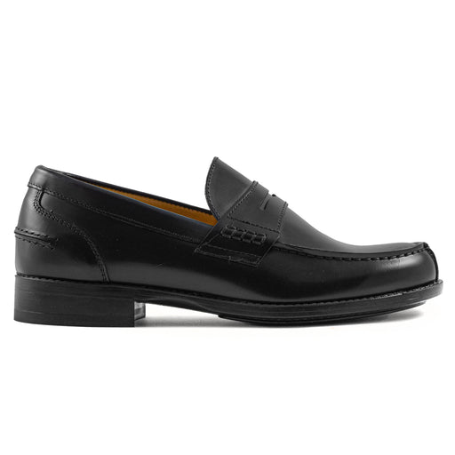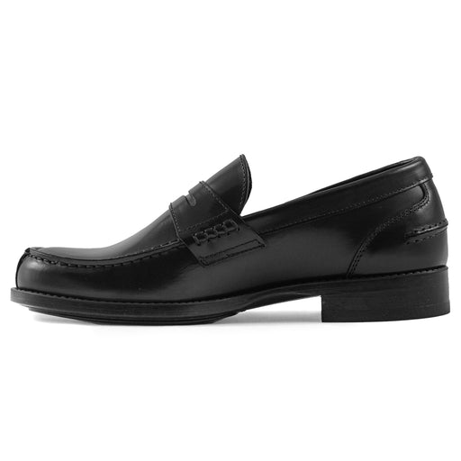 Riccardo P.• Black matte leather moccasin • Front band and tray • Rounded tip • Leather interior • Raised serrated welt • 4cm heel • Sturdy, serrated r...