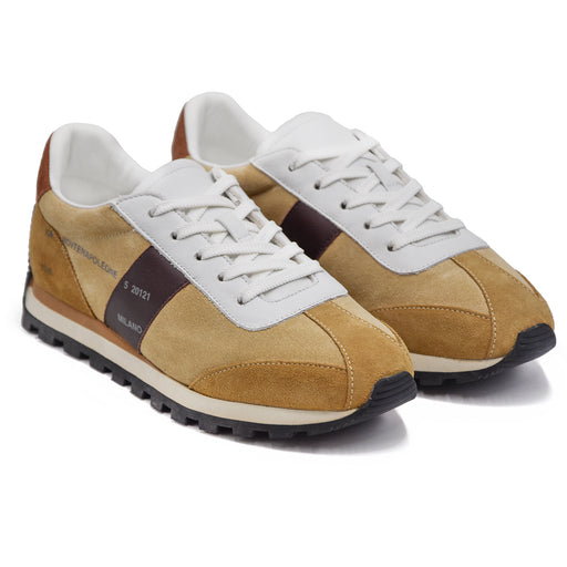Premiata• Taupe suede sneakers • Beige fabric and suede • White slip • Side logo • Leather interior • Removable insole • Contrasting details that en...