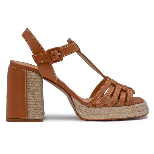 Chantal 1962• Sandal in wood-colored leather • Particular weave • Square tip • Straps that cross in the back, adjustable • Leather interior • 8 cm geometr...