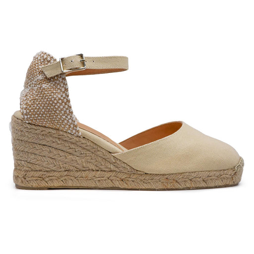 Castañer• Sand cotton canvas espadrilles • Contrasting closed heel • Cotton ribbon tied at the ankle • Rounded tip • Leather interior • Wedge covered...