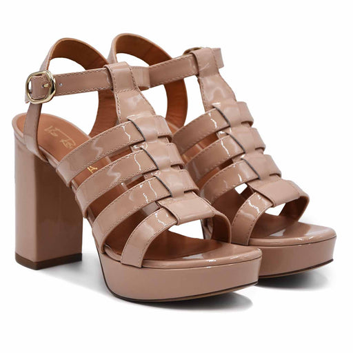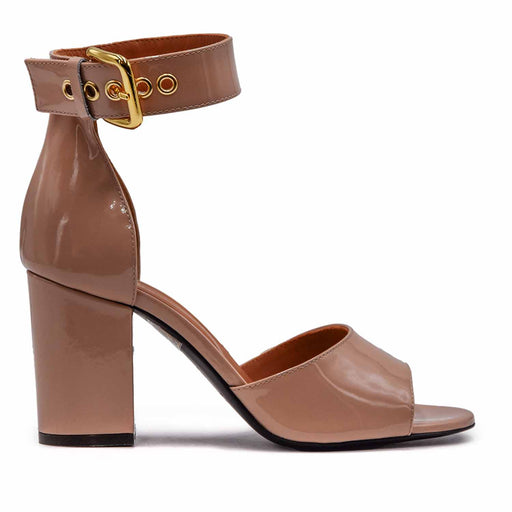 Sergio Levantesi• Stone patent sandal • Square neckline and toe • Adjustable ankle strap • Interior and insole in leather in nuance • Leather sole • 10cm pyr...