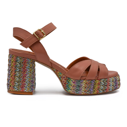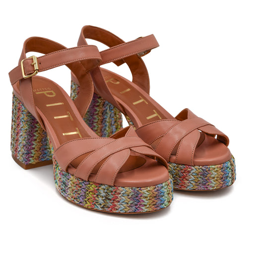Matteo Pitti• Peach leather sandal • Bold touch of style to the look • Adjustable strap • Heel and platform in multicoloured woven raffia • Heel height 8 ...