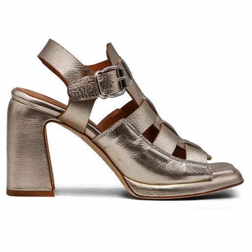 Enrico Lorenzetti• Silver laminated leather sandals • Adjustable T-Bar strap • Square tip • Leather insole • 7.5cm block heel • Regular fit • Article: 5431-405