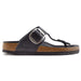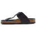 Sandalo Birkenstock da donna Made in Germany, modello Gizeh Big Buckle in pelle nabuk oliata nera lavorata a cuciture aperte.