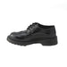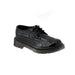 Scarpa allacciata Dr.Martens da bambino in vernice nera con impunture a vista, modello brogue con allacciatura a tre fori con lacci neri tondi.